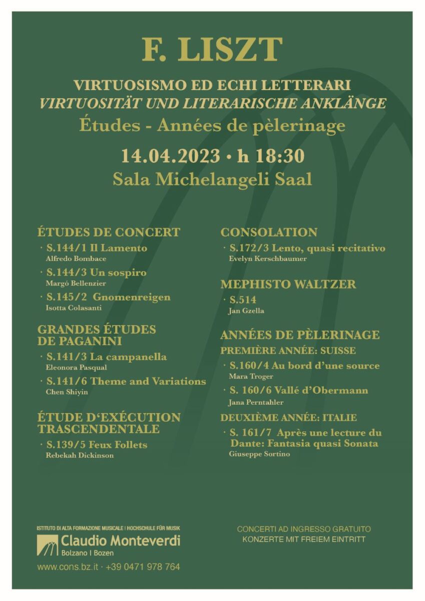 AmmissioniAUFNAHMEPRÜFUNGEN2025/2026Mehr InfosDottorati di ricercaDOKTORAT / PhDsMehr InfosCorsi liberiOFFENE KURSEMehr Infos AmmissioniAUFNAHME-PRÜFUNGEN2025/2026Mehr InfosDottorati di ricercaDOKTORAT / PhDsMehr InfosCorsi liberiOFFENE KURSEMehr Infos Doktorat / PhDs Mehr Infos Studienangebot Mehr Infos Zulassung & Einschreibung Mehr Infos Musik- & Instrumentenkurse für jedes Alter und Niveau Mehr Infos Erasmus+ Mehr Infos Events Alle events 21 Feb Open Days 11 Feb Das Spotlight Conducting – Bozner Dirigentenforum 2025 01 Jan Monteverdi in concert 01.2025 – 07.2025 03 Oct Monteverdi in concert 10.2024 – 12.2024 01 Sep Bella Musica: Junge Botschafter*innen der Europäischen Mozart-Wege 21 Jun “An die Musik”: Homage an Maurizio Pollini Orchester des Konservatoriums C. Monteverdi Neuigkeiten Das akademische Jahr 2023/24 wurde mit dem Eröffnungsonzert am 2. Dezember 2023 eingeweiht Weiterlesen » December 12, 2023 0 Wahl des StudentInnenbeirats für das Triennium 2023-2026 Weiterlesen » October 18, 2023 0 Prof. Marco Bronzi wurde zum Direktor des Konservatoriums “Claudio Monteverdi” in Bozen für den Dreijahreszeitraum 2023-2026 gewählt Weiterlesen » October 2, 2023 0 Wahl der Direktorin/des Direktors des Musikkonservatoriums “Claudio Monteverdi” Bozen für das Triennium 2023-2026 Weiterlesen » August 28, 2023 0